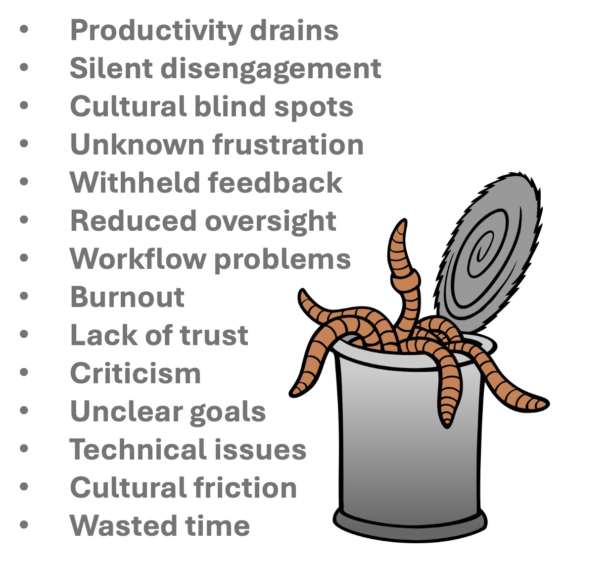 What’s in that can of worms that leadership is afraid to open? Listening to hidden truths will help clear productivity blocks and make reaching company goals more realistic. Good-bye worms.